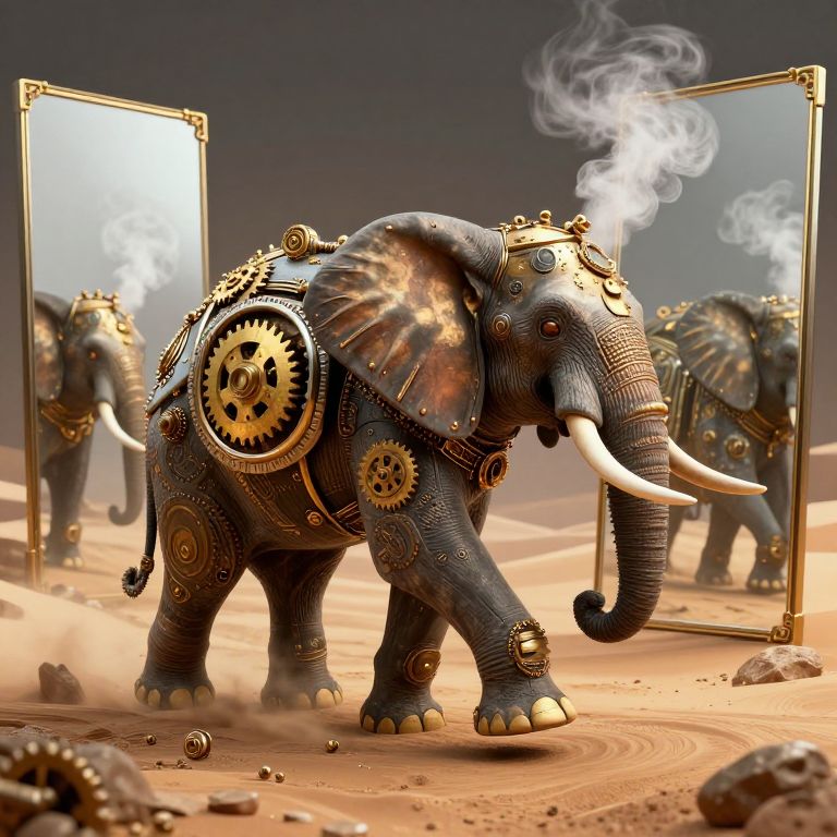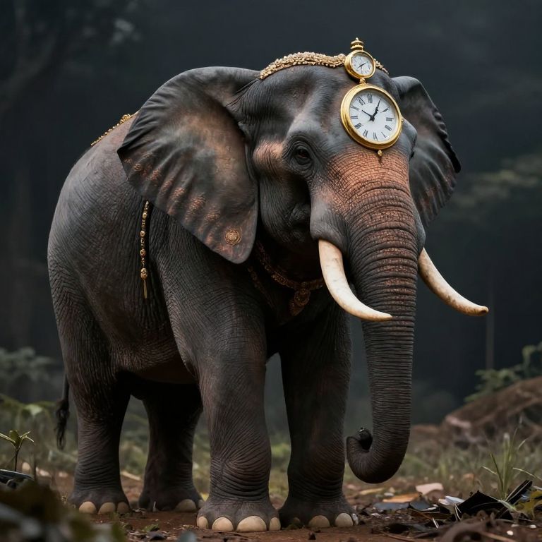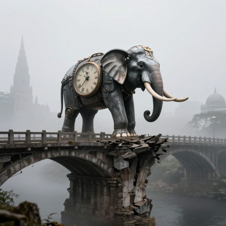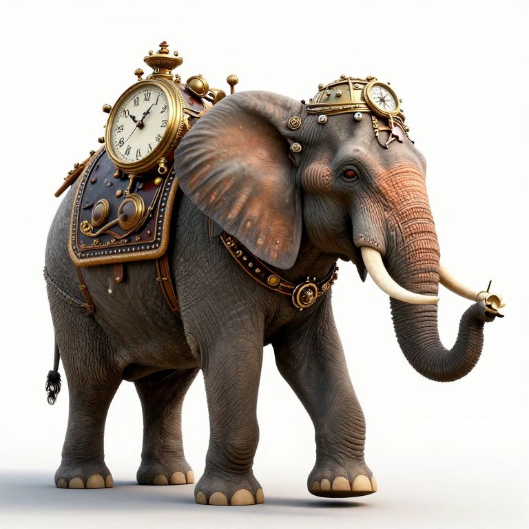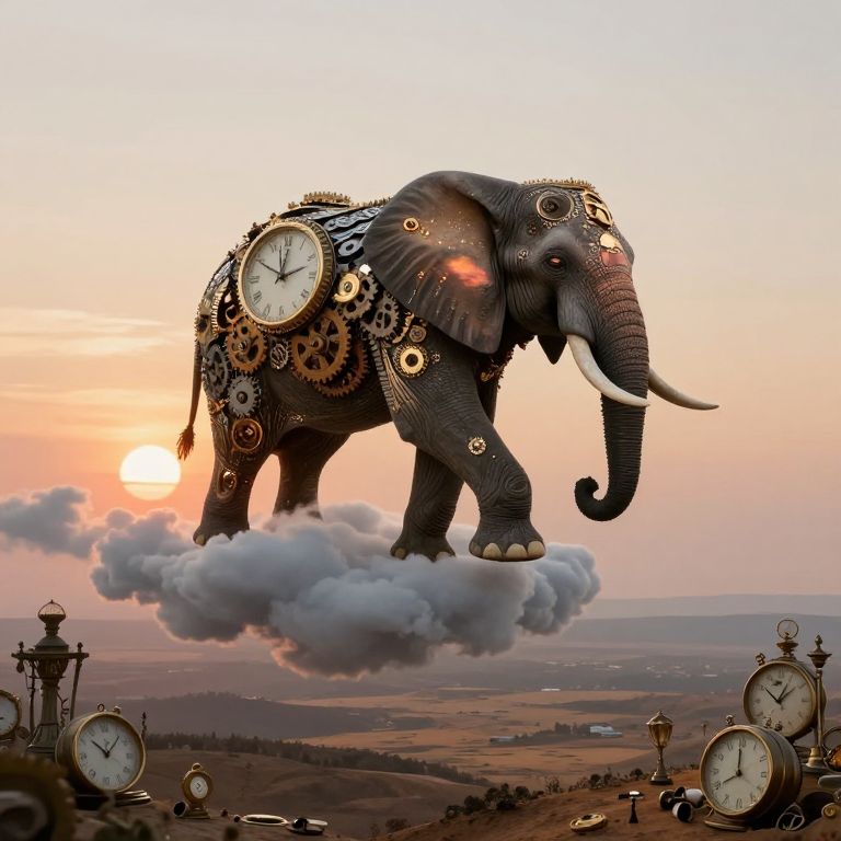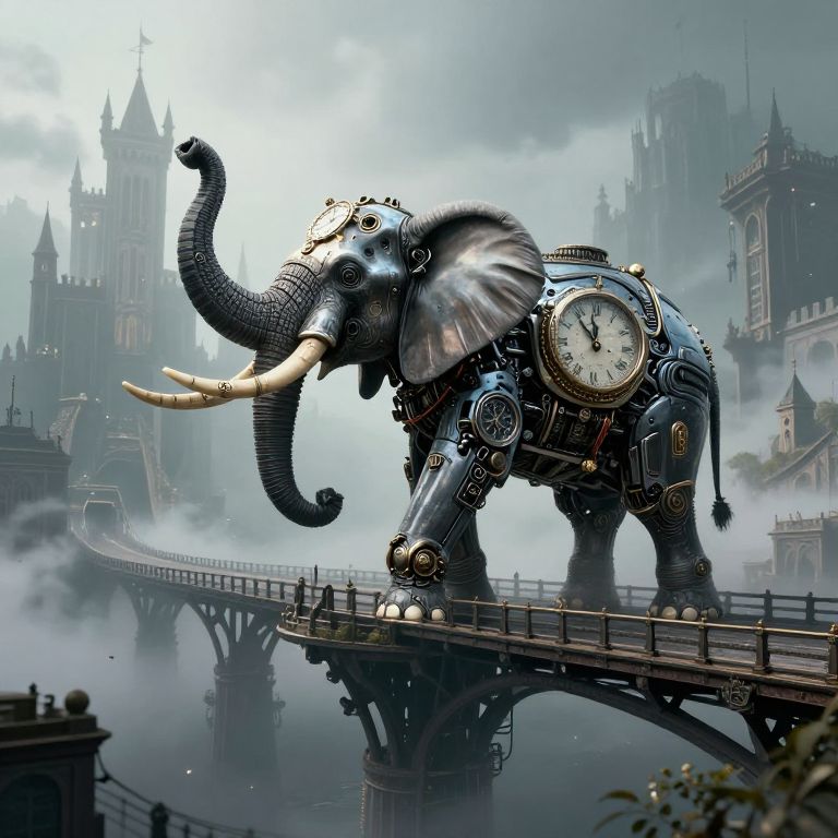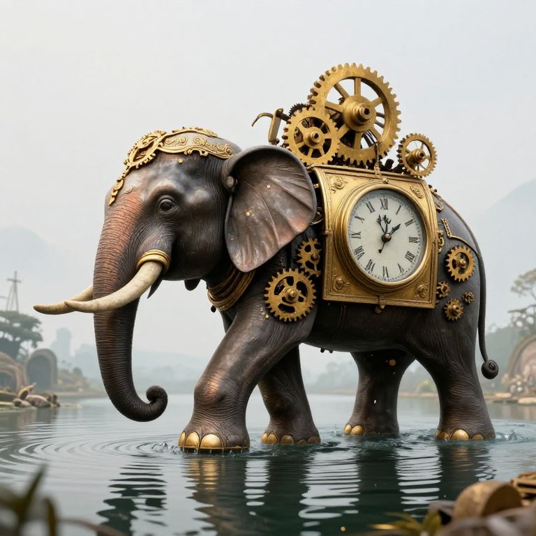 Clockwork elephant strides forward, its massive form adorned with intricate golden gears and a large ornate clock face strapped to its side, leaving ripples in the water beneath its feet as it traverses through a surreal, timeless landscape.