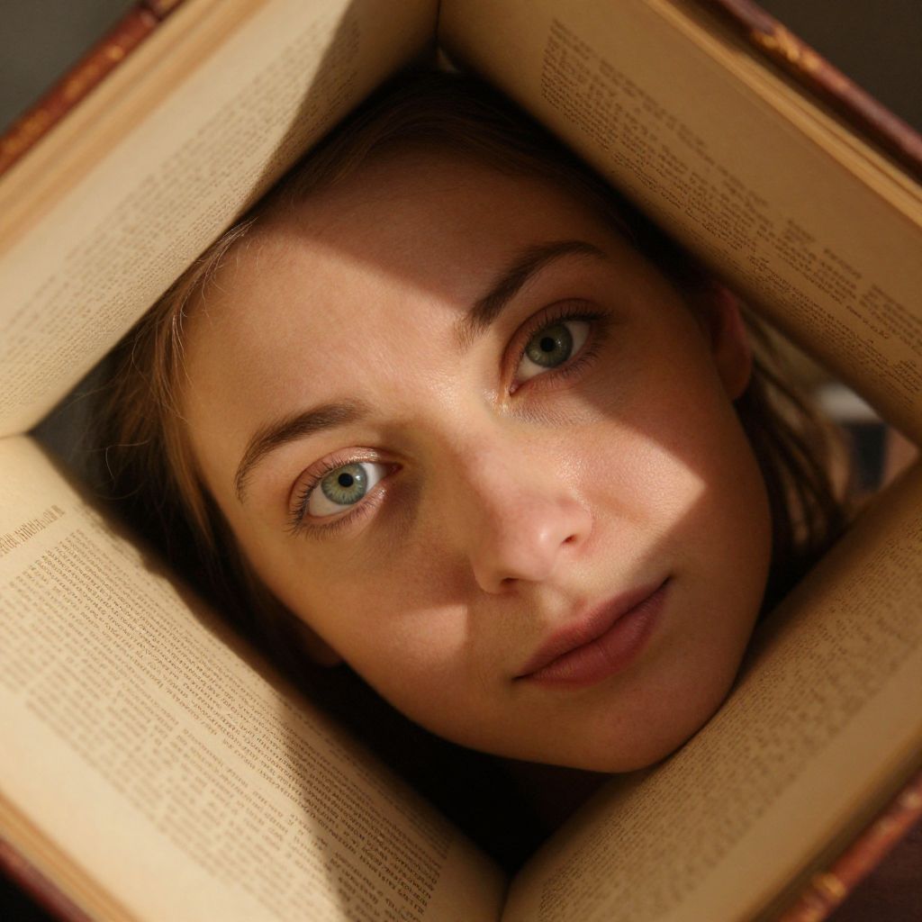 Envision a captivating portrait of an Eastern European woman with mesmerizing emerald eyes, captured from an intriguing 'bug's-eye view' perspective within the pages of an ancient leather-bound book. Warm golden light filters through the sturdy vellum parchment, casting enchanting shadows across her porcelain skin and highlighting subtle creases around her eyes—a testament to wisdom and intrigue. As she tilts her head slightly, a wistful smile graces her lips, hinting at untold tales and secrets locked within the surrounding pages, beckoning viewers on an intimate journey through time and memory.