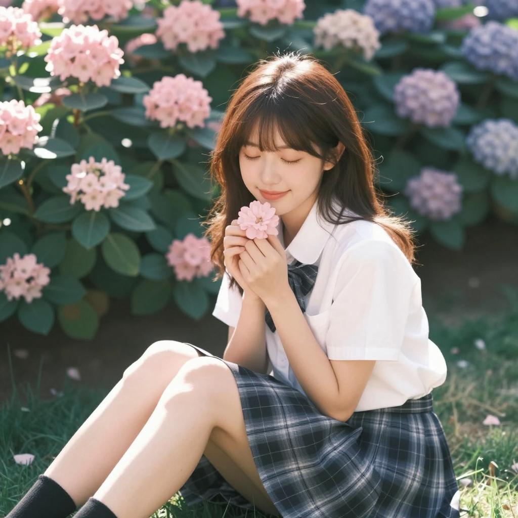 Portrait of a young woman with long brown hair wearing an off-shoulder pink dress, holding a wicker basket filled with white daisies. She gently smells one daisy with her eyes closed. The background is softly blurred with hints of greenery and a pinkish field.