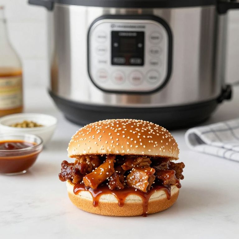 Succulent pulled pork sandwich dripping with rich barbecue sauce sits atop a sesame seed bun, positioned centrally on a white countertop, with a stainless steel Instant Pot and two small bowls containing sauce and condiments visible in the softly blurred background.