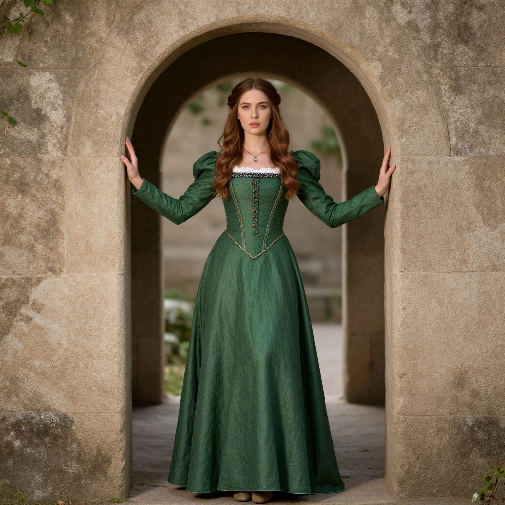 Green medieval dress costume, a woman in a green dress standing in an archway