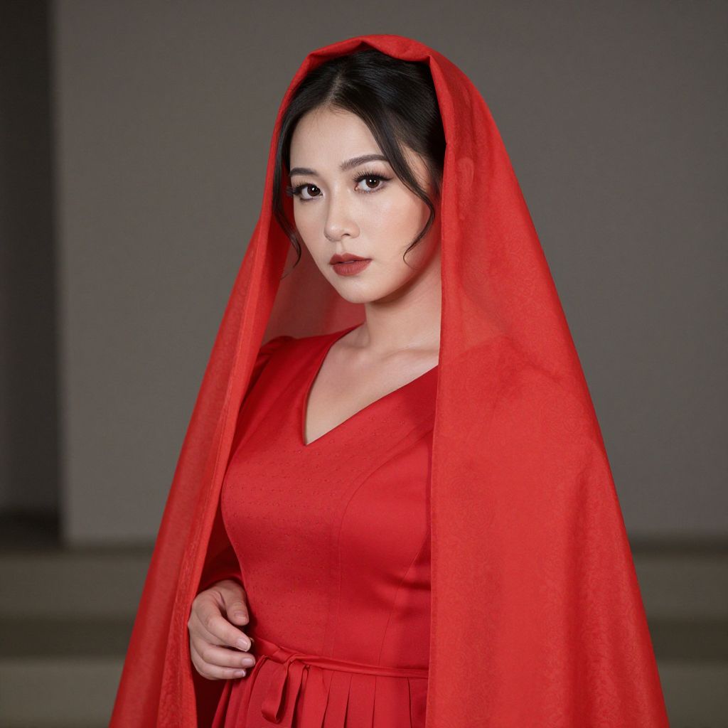 Photograph of an East Asian woman with fair skin and black hair, styled in an elegant updo. She wears a vibrant red dress with a V-neck and a matching red shawl draped over her head and shoulders, covering her hair. Her makeup is subtle yet accentuates her large, dark eyes and full lips. She gazes directly at the camera with a neutral expression. The background is a simple, dimly lit gray, keeping the focus on her. The texture of the shawl is soft and slightly translucent, contrasting with the smooth fabric of her dress.