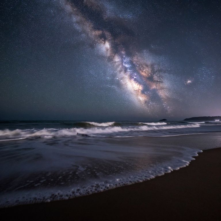 Photograph of a nighttime beach scene featuring the Milky Way galaxy stretching across the starry sky. The sky is deep blue and black with bright white stars and nebulae. Waves gently roll onto the dark, wet sand in the foreground, reflecting some starlight. The horizon is faintly visible in the distance, with a small, dark landmass on the right side. The overall texture is smooth with the contrast between the dark sand and the bright, sparkling sky. The image captures a serene and ethereal atmosphere.