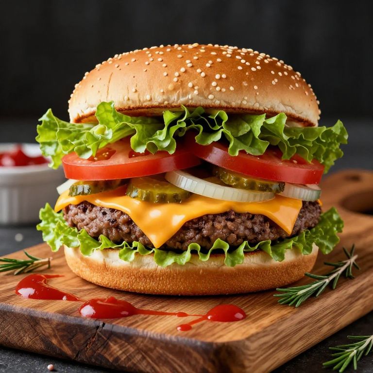 Whopper, an appetizing hamburger bursting with layers of crisp lettuce, juicy tomato slices, onions, pickles, and cheddar cheese, resting on a rustic wooden board with herbs and ketchup splattered artistically, photographed in dramatic light for an epic food shot.