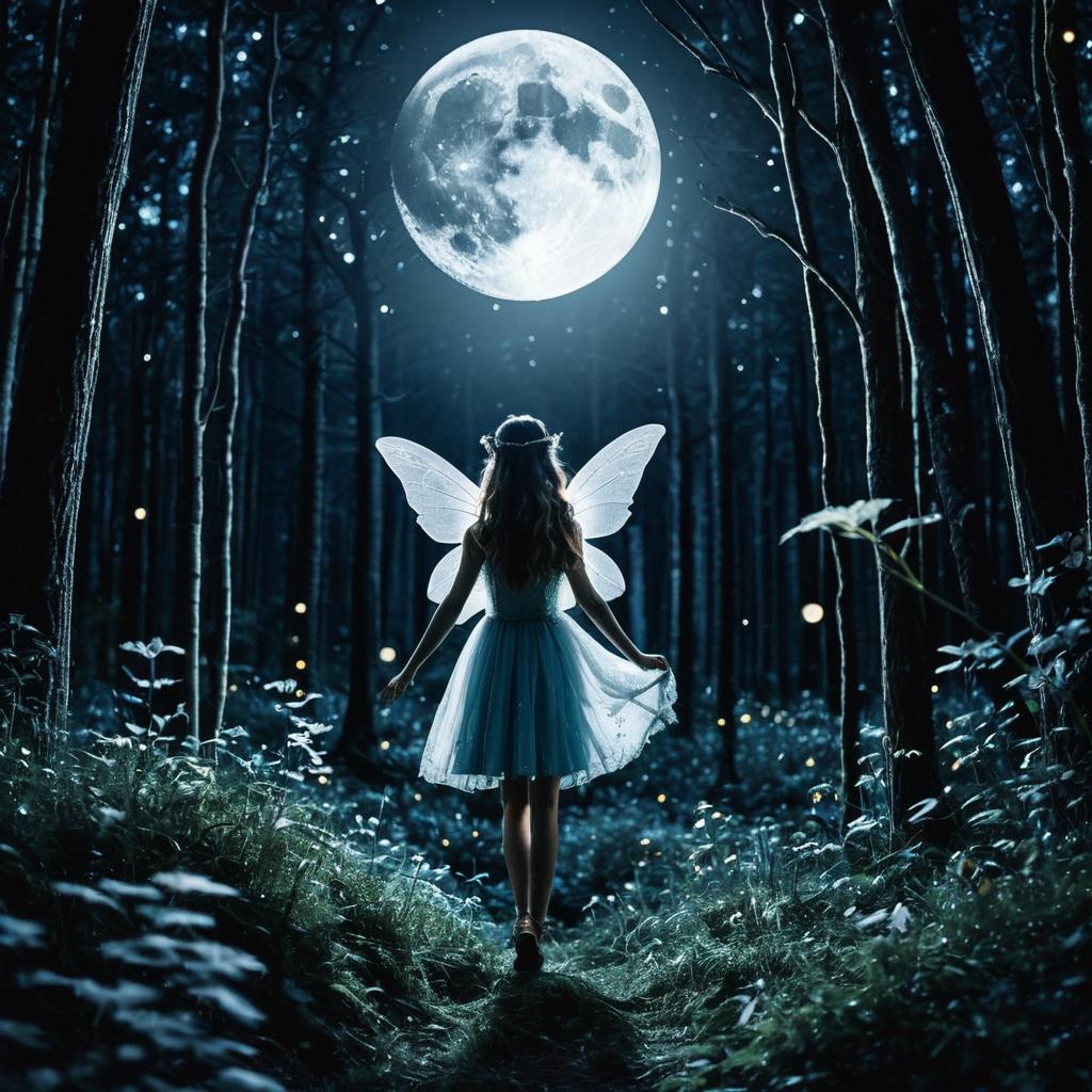 Close-up of a transparent glass dragonfly with detailed wings resting on moss in an enchanted forest at twilight, reflecting on a still water surface with a glowing full moon in the background.
