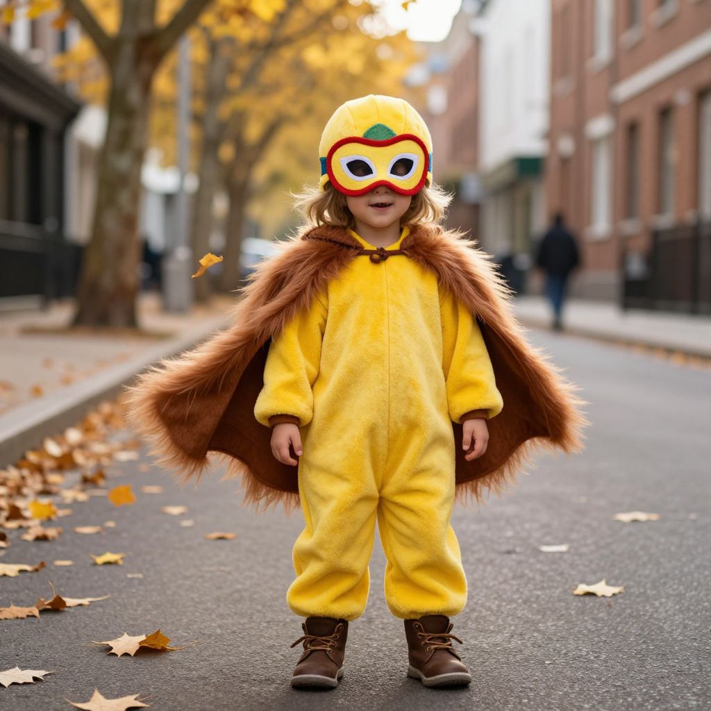 A young child, around 5 years old, is dressed in a vibrant yellow and brown costume featuring a colorful mask with wide, expressive eyes and a small, playful smile, along with a fluffy, slightly flowing cape in warm brown tones. The child is standing confidently on a quiet city street during autumn, with golden leaves scattered across the pavement, some gently drifting in the breeze. The background shows a mix of brick buildings and soft sunlight filtering through the trees, creating a warm, nostalgic atmosphere. The scene is detailed and charming, capturing the joy and curiosity of a child in a festive, seasonal setting.