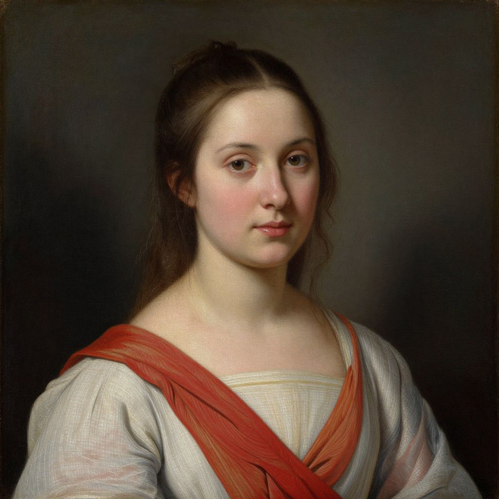 This is a realistic oil painting of a young woman with fair skin and brown hair, parted in the middle and gently pulled back. She has soft, pinkish cheeks and a calm, slightly smiling expression. She is wearing a white, slightly translucent dress with puffed sleeves and a red sash with gold trim draped over her right shoulder. The background is dark and unadorned, emphasizing the subject. The lighting is subtle, highlighting her facial features and the texture of her dress. The painting style is classical, focusing on naturalism and realistic detail.