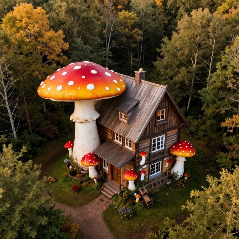 An enchanting surreal landscape showcases a charming wooden cottage harmoniously integrated within an abundant forest. The dwelling's walls are adorned with oversized, vivid mushrooms, reminiscent of Dutch still-life masterpieces. The scene is captured from a high vantage point, mirroring the aerial perspective of a soaring bird, granting a panoramic view of nature and architecture coexisting in perfect harmony. The color palette consists of warm earthy hues, punctuated by bold reds and yellows, creating an alluring dreamlike ambiance that evokes both serenity and fascination.