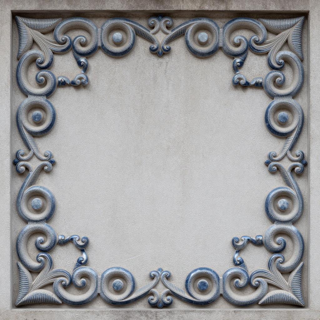 Scrollworks pattern featuring engraved gunstock-style scrolls with tight spirals and shading in steel blue scrollwork on foggy grey arranged as corner flourishes framing an empty central space on stone relief carving on a wall rendered as screen-printed poster style with a few solid colors, ultra-detailed, sharp ornamental design, high resolution, intricate decorative pattern art