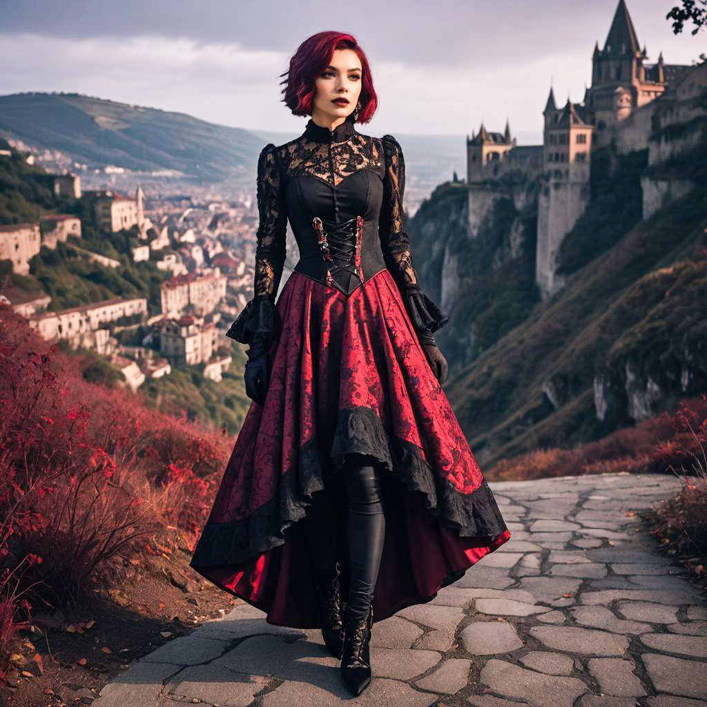 Photo of a S-Shaped woman, Messy Bun, rbd outfit, red and black dress with gothic style, lace details, corset top, Silk fabric, knee-length with dramatic flair, dark elegance, Falu Red accents, platform shoes, tea room, STYLE:cinecolor