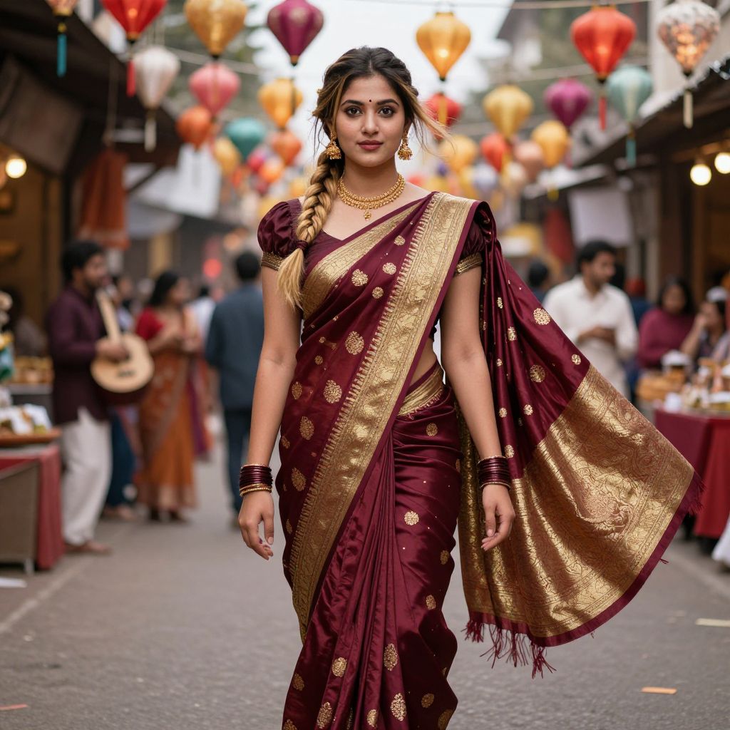 Photograph of a confident Indian woman in a maroon and gold traditional saree, walking a bustling market street with colorful paper lanterns in the background
