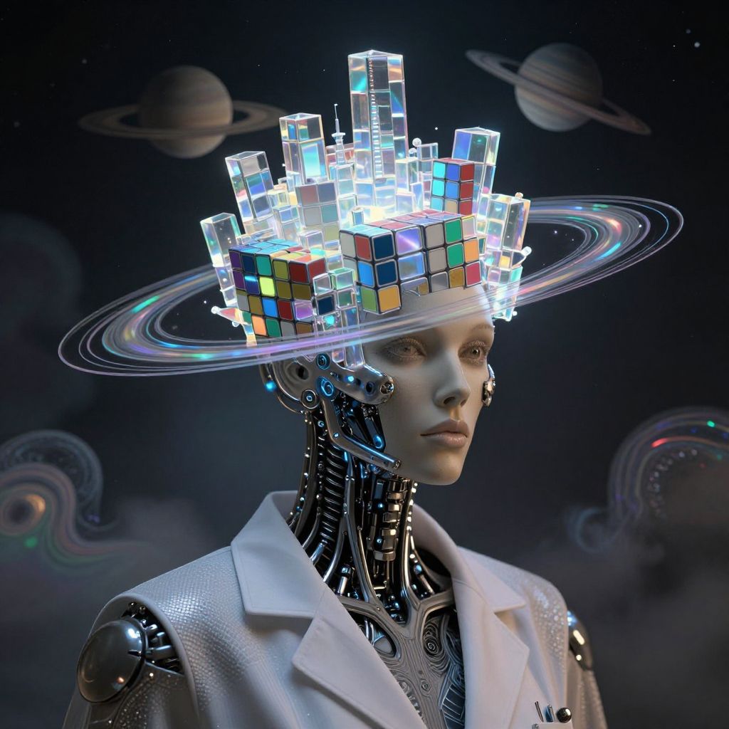 Photorealistic CGI image of a futuristic, cybernetic woman with a metallic, robotic neck and shoulders. She wears a white, textured jacket and has a glowing, floating crown of colorful, illuminated Rubik's cubes encased in a translucent, ring-like structure. Her expression is calm and focused. The background is a dark, starry space with faint, glowing rings resembling planets. The overall style is sci-fi, with a blend of neon lights and metallic textures, emphasizing a blend of human and machine elements.