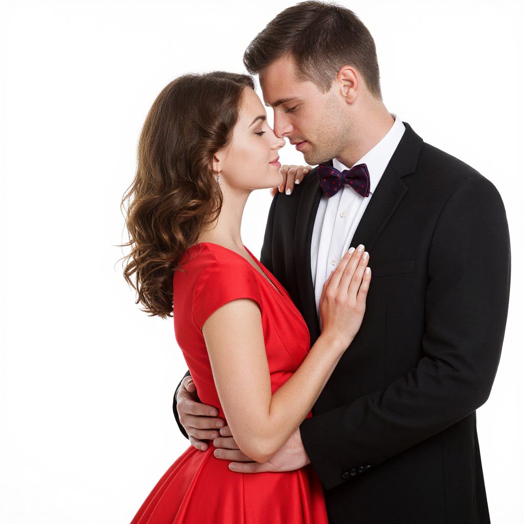 Romantic couple dressed elegantly in formal attire, with the man wearing a black tuxedo and a red polka-dot bow tie, and the woman in a vibrant red dress, sharing a tender moment against a pristine white background.
