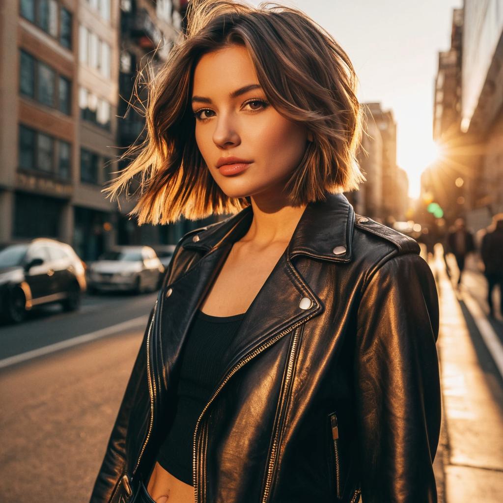 Ash Brown hairstyle on fashion model, wearing leather jacket and slim jeans, in city background, captured in fashion editorial style with clean tone.
