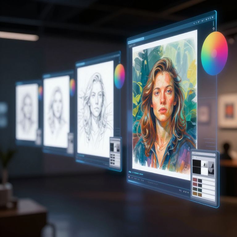 How to render art visualization, multi-stage progression of an artwork from initial sketch to fully rendered digital painting displayed on holographic screens, surrounded by floating color wheels and brush presets, immersive atmosphere with soft focus and ambient lighting