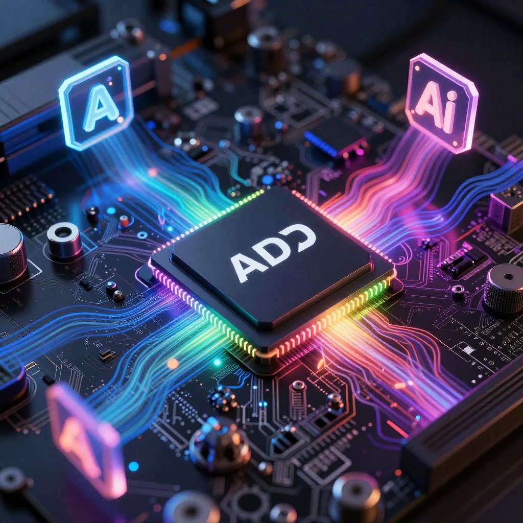 Stable diffusion for AMD rendered as a high-tech motherboard with AMD chips at the center, radiating complex diffusion patterns in vivid RGB lighting, surrounded by floating 3D AI symbols and data flows.