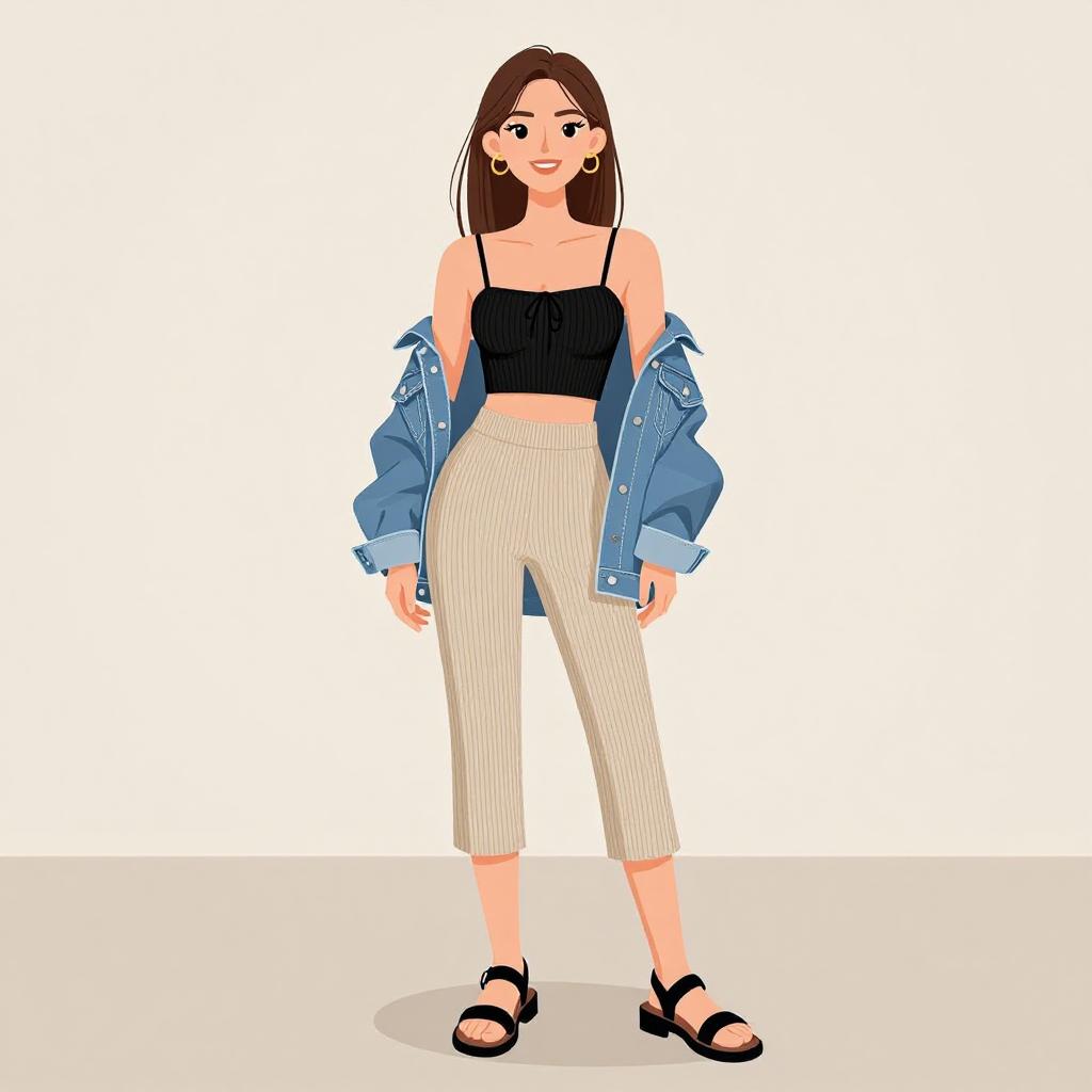 Woman with pretty face and pretty hair. smiling Woman, contemporary casual, ribbed crop top in black with front tie detail, square neckline, spaghetti straps, high-waisted culottes in a beige knit texture, cropped below the knee, oversized light blue denim jacket worn off the shoulder, black and white chunky sandals, minimalist makeup, simple straight hairstyle, studio background with minimal shadow, light-colored floor. --sref 1467