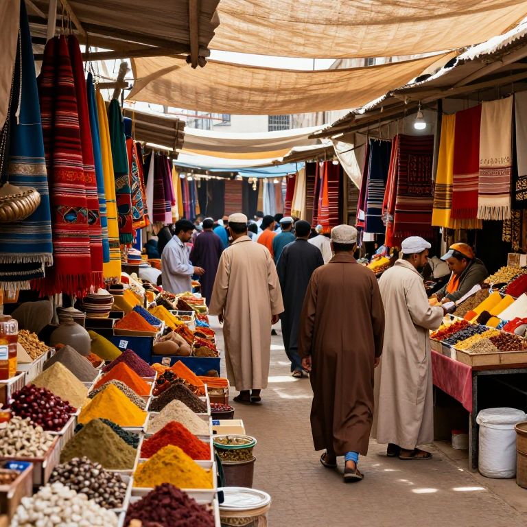 Photograph of a bustling Middle Eastern market with colorful spices, woven textiles, and vendors in traditional white and brown robes.