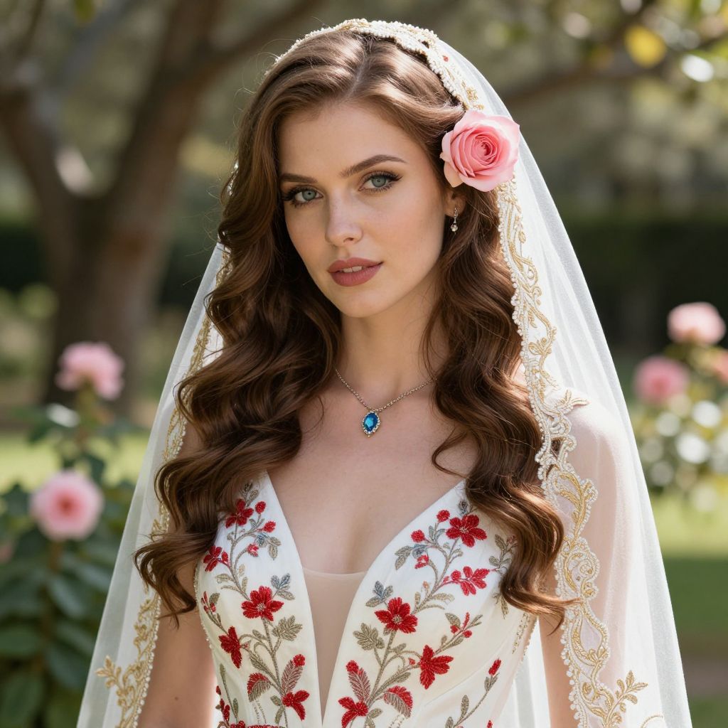 Photograph of a beautiful woman with long, wavy brown hair and fair skin, wearing a white wedding dress with red floral embroidery and a deep V-neck. She has a pink rose in her hair and a sheer white veil with gold patterns draped over her head. Her blue eyes are softly focused, and she's wearing a delicate necklace with a blue gem. The background is a sunlit garden with blurred trees and pink flowers.