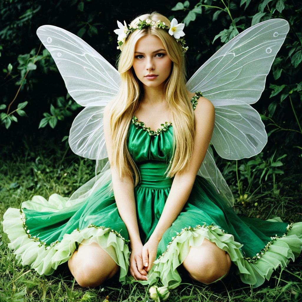 Flower fairy costume adults,1girl, flower, wings, solo, blonde hair, fairy, dress, fairy wings, sitting, green dress, realistic, long hair, hair flower, looking at viewer