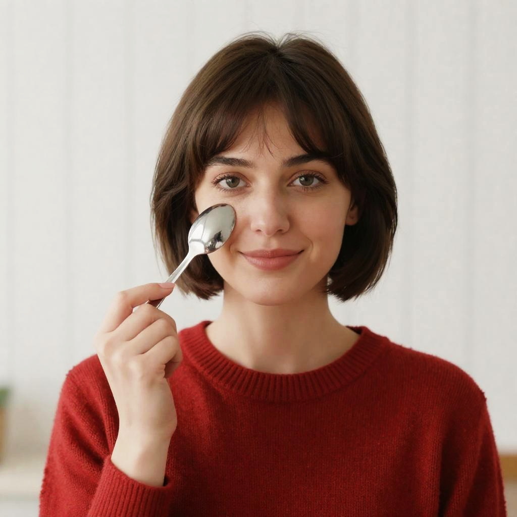Photograph of a woman with short brown hair, bangs, and light skin. She smiles slightly and holds a spoon to her right cheek with her right hand. She wears a red, knitted sweater. Background features vertical white blinds.