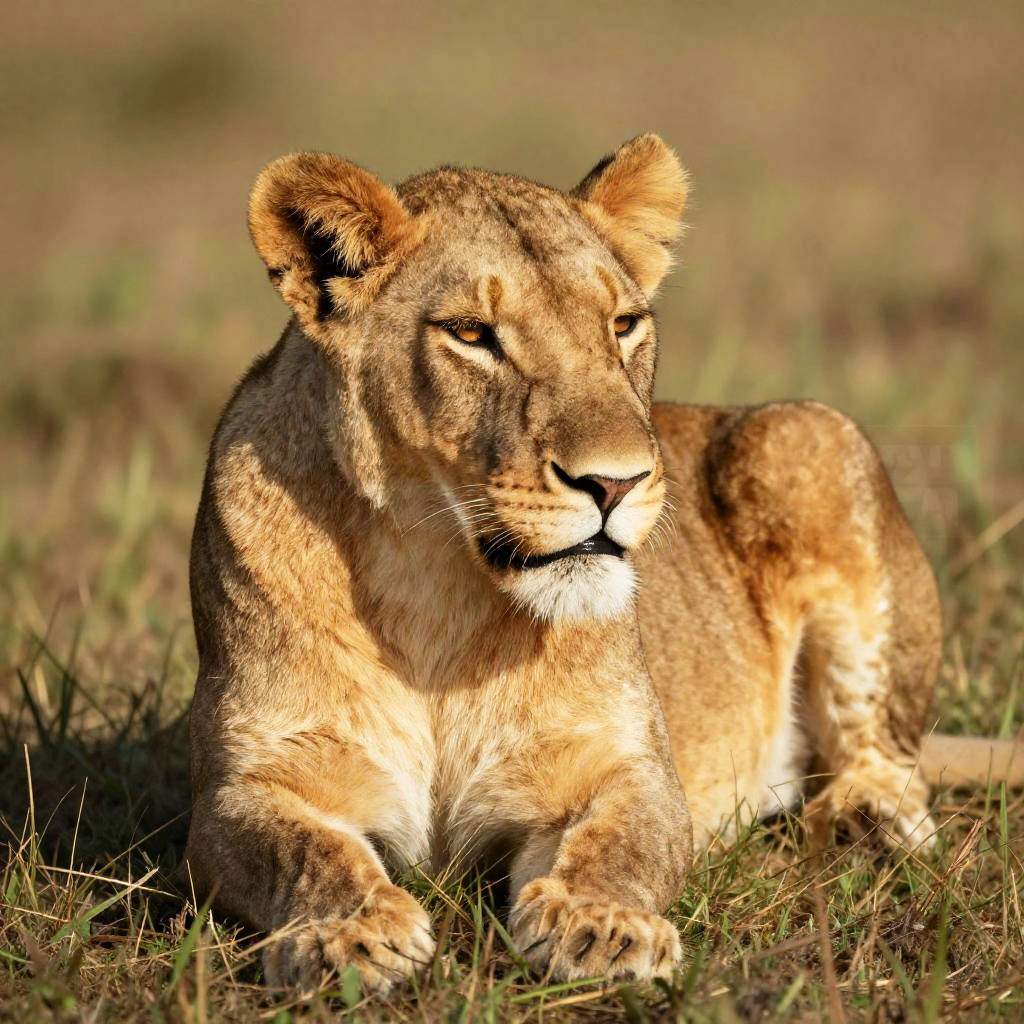 Photograph of a lioness lying in sunlit grass, holding a wildebeest's antelope horn in her mouth, with a golden grass