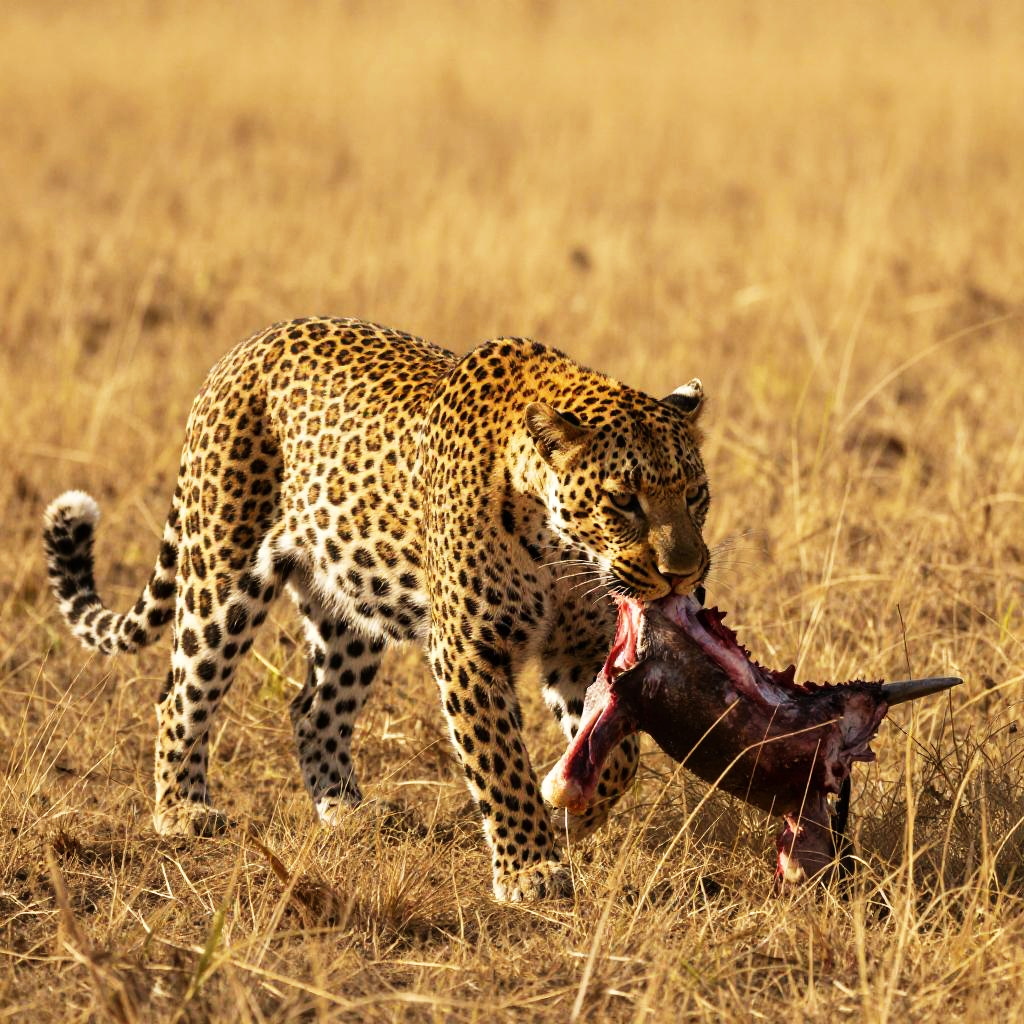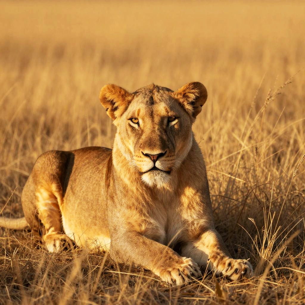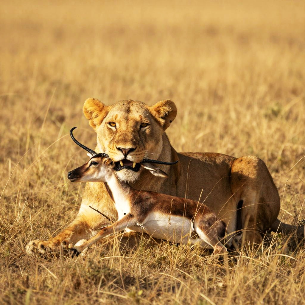 Photograph of a lioness lying in tall, golden grass, holding a freshly caught antelope in her mouth. The lioness has a tawny coat with a white underbelly and dark brown spots, and her eyes are focused ahead. The antelope's black and white legs and brown body are visible, with its head partially obscured by the lioness's mouth. The background is a vast, sunlit grassland, creating a warm, golden hue throughout the image. The lioness's paws are positioned on the grass, and her body is relaxed yet alert.