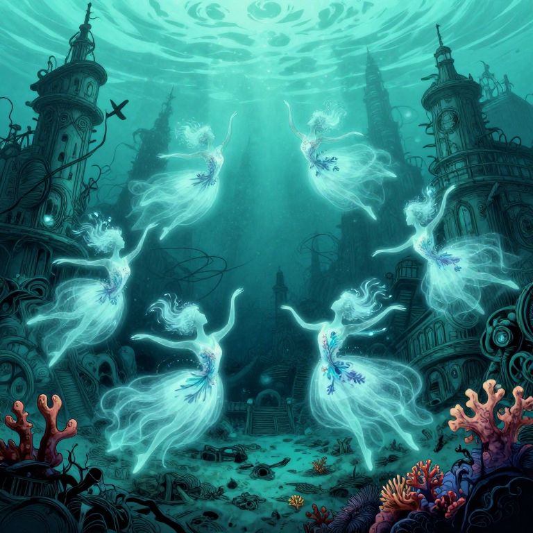 Imagine an enchanting underwater ballet performed by ethereal dancers in a pen-and-ink illustration style, where ghostly figures adorned with bioluminescent flora gracefully swirl around a sunken, neo-Victorian cityscape. From an overhead perspective, these spectral beings move through a dreamlike, aquamarine world filled with twisted metal and eerie silence, their movements evoking a sense of melancholic beauty and profound mystery. The scene captures the delicate balance between light and darkness, life and decay, as vibrant coral and eerie shadows dance in harmony to create an unforgettable tapestry of the deep ocean's secrets.