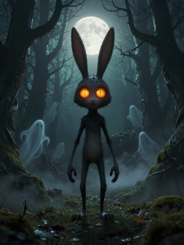 Spooky stylized rabbit character standing upright in the center of a dark eerie forest clearing at night, huge glowing amber eyes staring at the viewer, long skinny limbs and slightly exaggerated proportions, surrounded by twisted trees and faint ghostly silhouettes, swirling mist filling the air, full moon glowing in the background, cinematic wide-angle shot, dark whimsical gothic fantasy style, highly detailed 3d illustration, soft volumetric muted teal twilight, high resolution