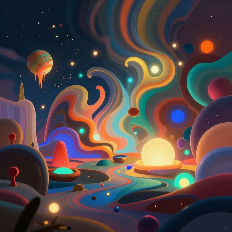 Vibrant, surreal digital art of a cosmic landscape with swirling, colorful waves, glowing orbs, and lava-like lights against a starry night sky
