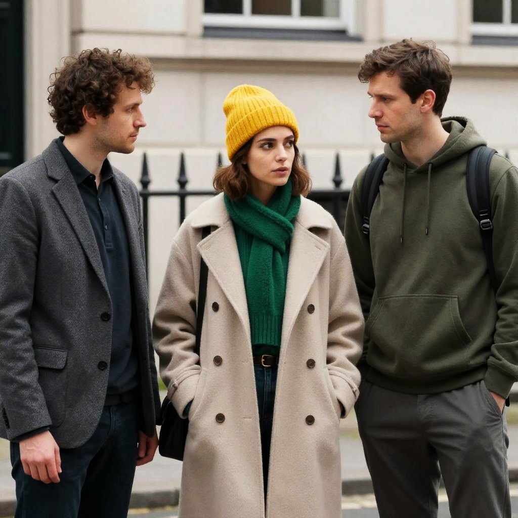 Photograph of a bookstore event. Central couple: man in gray blazer, black shirt, black pants; woman in red jacket, white shirt, blue jeans. Man stands left, woman stands right. Audience claps, seated on right. Bookshelves with colorful books in background. Other people in audience, blurred. Man's expression serious, woman's expression neutral. Two men in background, one clapping, other speaking. Warm indoor lighting.