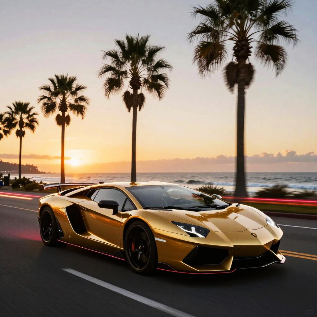 Photograph of a sleek, golden Lamborghini driving on a coastal road at sunset, with palm trees and a vibrant orange sky.