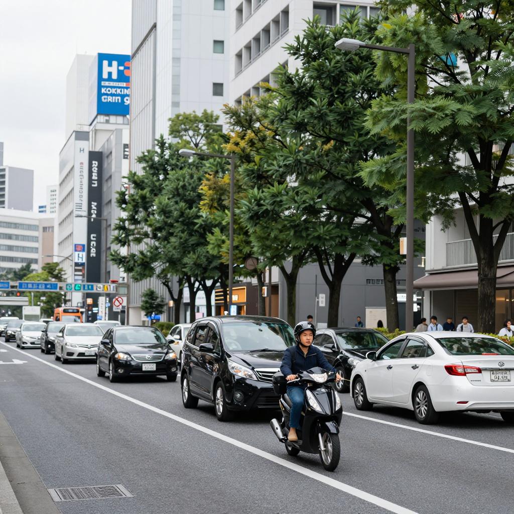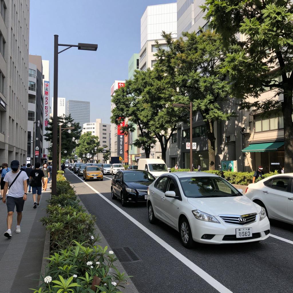 Urban street scene in Tokyo during daytime showing a line of cars and a white van on the road. Several pedestrians, mostly young males, walk along the sidewalk next to modern buildings. Trees and green shrubs line the street with clear blue sky above. Japanese signage is visible on buildings, confirming the location as Tokyo city.