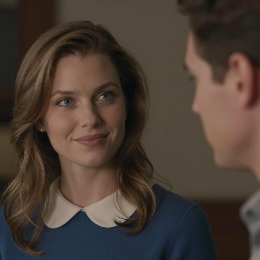 Blonde woman with wavy hair, wearing a pink t-shirt and floral shorts, stands in a dimly lit room. She smiles slightly. Background includes a table with bottles, green chair, lamp with warm light, and curtains with tree pattern. Radios and window with dark outside visible.