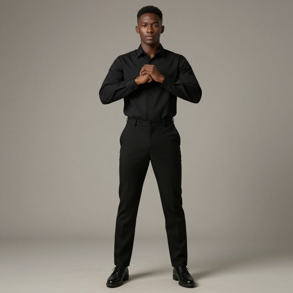 Photograph of a tall, athletic Black man standing against a plain gray background. He has short, neatly cropped hair and a clean-shaven face. He is wearing a black long-sleeve button-up shirt with the sleeves slightly rolled up and black trousers, both fitted and tailored. His hands are clasped together in front of him at chest height. He is also wearing black, polished dress shoes. His expression is serious and focused. The lighting is even, highlighting his figure and the textures of his clothing. The overall style is minimalist and professional.