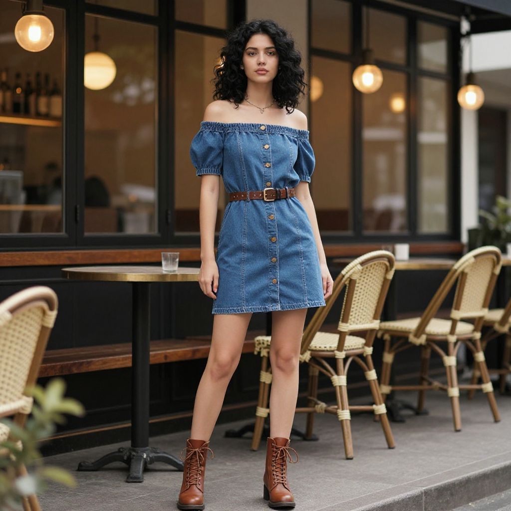 Photograph of a young woman standing outside a cozy café. She has wavy black hair, light skin, and wears an off-the-shoulder, button-up denim dress with a brown belt and brown lace-up ankle boots. The background shows dark-framed windows, warm hanging lights, and wicker café chairs. The overall vibe is chic and stylish.