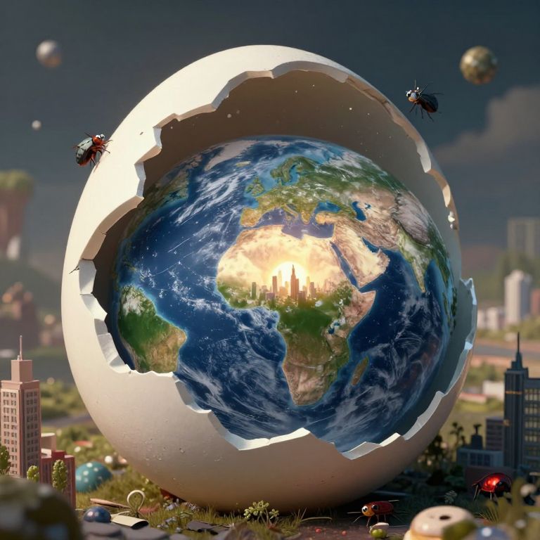 This CGI image depicts a massive, cracked, white spherical sculpture enclosing a detailed, illuminated Earth with visible continents and city lights over Africa. Surrounding the sphere are various insects, including black beetles and wasps, hovering in the dark, cloudy sky. The ground beneath the sphere is grassy with small buildings and structures scattered around. The Earth's surface is vibrant with blue oceans, green landmasses, and swirling white clouds. The background includes blurred city skyscrapers, adding a futuristic urban contrast to the natural elements. The image combines elements of surrealism and digital art, emphasizing the fragile relationship between nature and human-made structures.