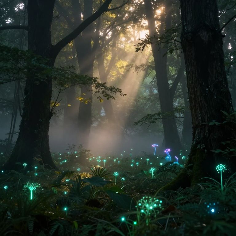 Wanbd serene forest scene with bioluminescent flora and magical creatures, soft mist swirling through ancient trees, warm golden light filtering through leaves, ethereal mood, highly detailed natural textures