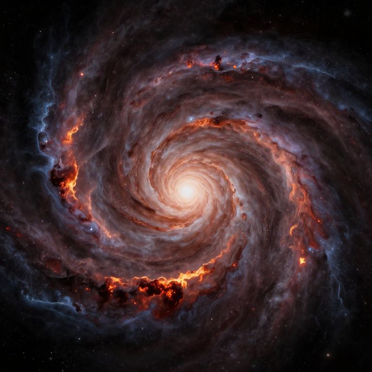 A cosmic vortex spirals through a celestial void, its swirling clouds aglow with fiery embers, defying gravity as they encircle an endless abyss.