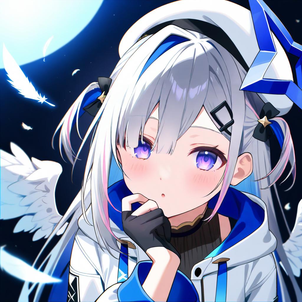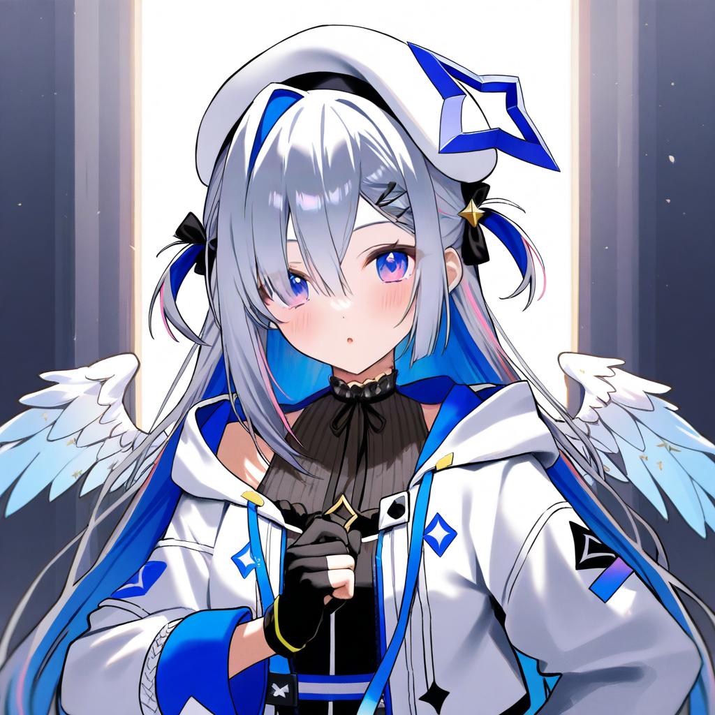 Amane kanata (work), hololive, 1girl, angel wings, angel, angel wings, purple eyes, hair over one eye, blue hair, grey hair, colored inner hair, single hair intake, official alternate hairstyle, long hair, official alternate hair length, streaked hair, pink hair, asymmetrical bangs, two side up, hairclip, black gloves, partially fingerless gloves, white jacket, black dress, white headwear, star halo, virtual youtuber, virtual youtuber, feathered wings, white wings, mini wings, feathered wings, white wings, mini wings, beret, by artist gnns, animagine