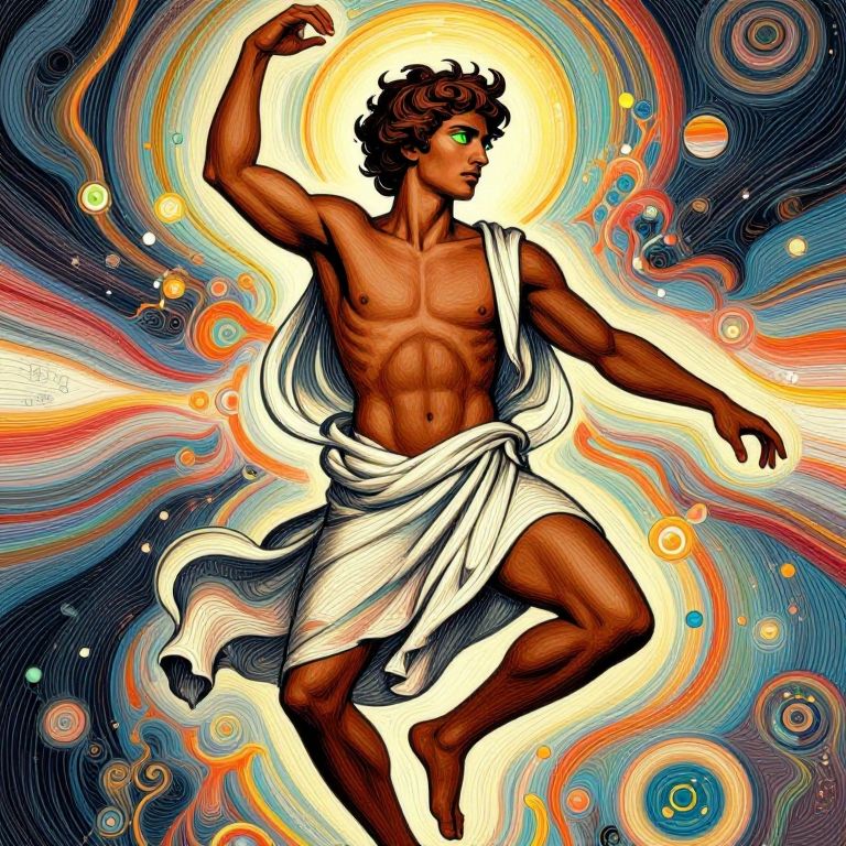 This digital art piece depicts a muscular, dark-skinned male figure with curly brown hair, resembling a classical Greek god. He is shirtless, showcasing a defined chest and abs, and wears a white toga that drapes around his waist and thighs. He strikes a dynamic pose with one arm raised and the other extended, surrounded by swirling, vibrant colors of blue, orange, yellow, and red. A radiant, glowing halo encircles his head, adding a celestial feel. The background features abstract, cosmic patterns with circular shapes and lines, enhancing the divine and ethereal atmosphere. The artwork combines elements of realism and surrealism.