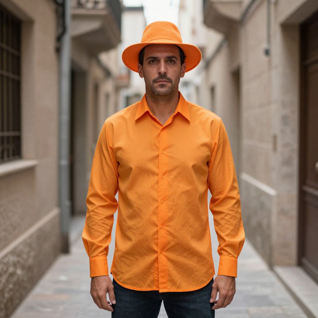 Photograph of a middle-aged man with a short beard and mustache, wearing an orange, long-sleeved button-up shirt and an orange wide-brimmed hat. He stands in a narrow, urban alleyway with beige stone walls and metal barred windows. The alley is slightly blurred, focusing attention on the man. He has a serious expression and is wearing dark blue jeans. The bright orange of his shirt and hat contrasts with the muted tones of the alleyway, creating a striking visual effect. The lighting is natural, suggesting an outdoor setting.