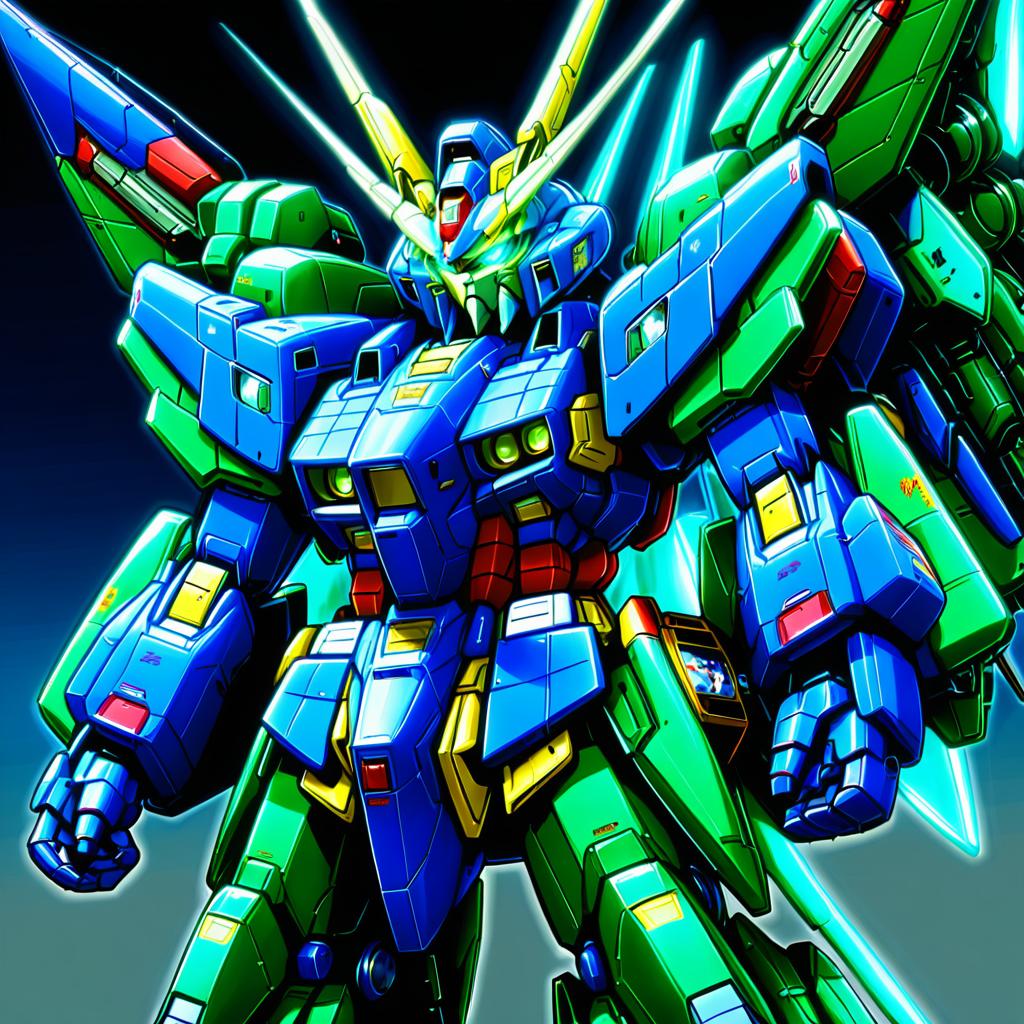 Detailed illustration of a blue and green Gundam mecha robot with glowing eyes and prominent V-fin antennae. The mechanical suit features intricate armor plating, highlighted with yellow and red accents, and is depicted in a dynamic pose with illuminated energy effects in the background. The design is inspired by anime aesthetics and features advanced mobile suit technology.