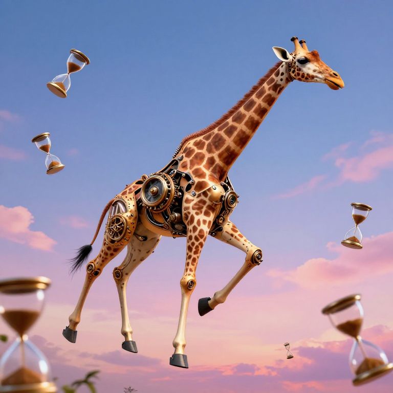 Clockwork giraffe soaring gracefully through a vibrant sky, its metallic hooves equipped with jet engines, surrounded by a scattering of floating hourglasses that defy the passage of time.