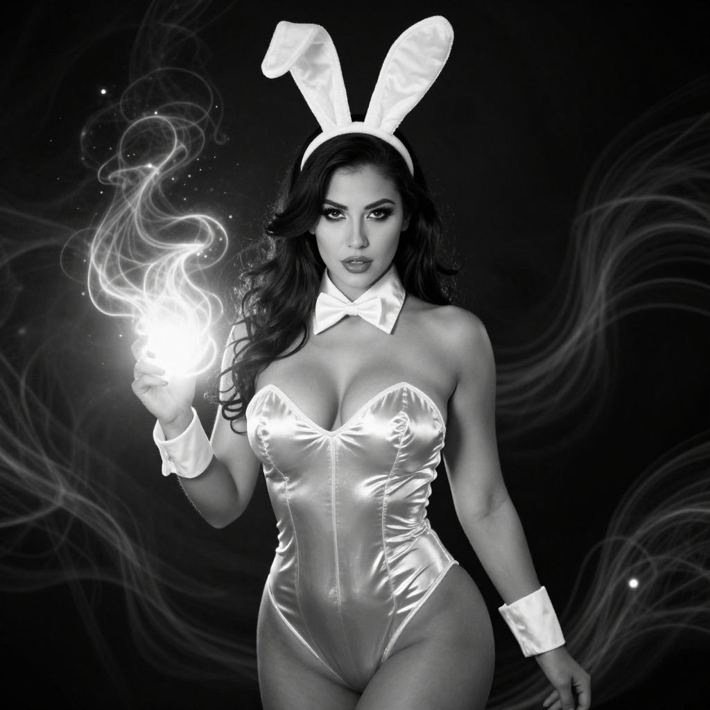 Black-and-white digital artwork of a sultry, curvy woman with long hair, wearing a tight, shiny bunny costume with a headband featuring bunny ears. She's holding a glowing, ethereal light in front of her, creating a halo effect. The background is dark with abstract, swirling patterns. Her intense gaze and the dramatic lighting give the image a mysterious, almost supernatural vibe.