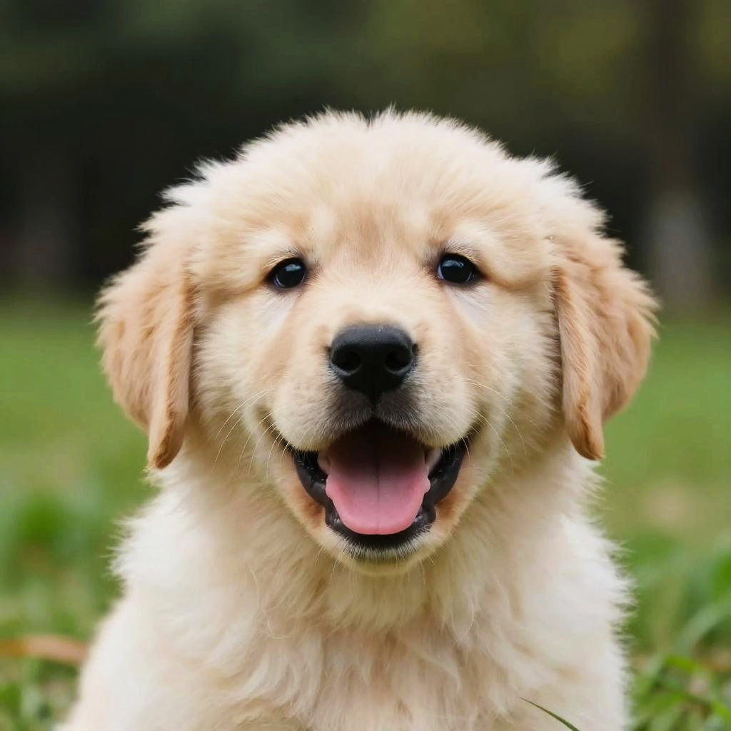 Aah expression of a cute golden retriever puppy, mouth open in surprise, big sparkling eyes, soft focus background with lush greenery, natural sunlight