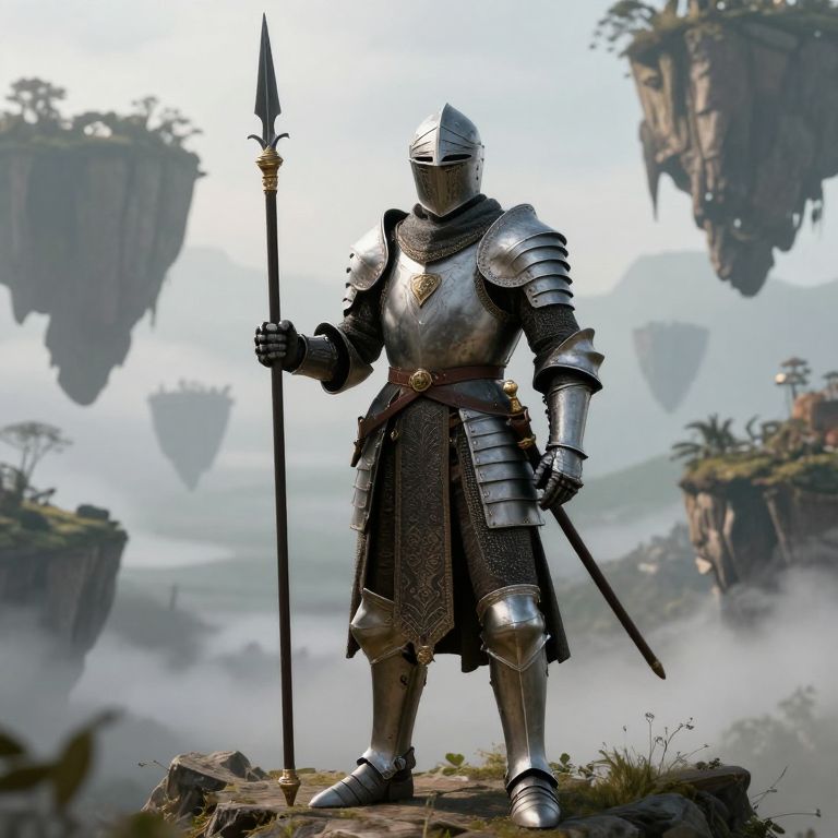 Digital art of a knight in silver armor with a spear, standing on a misty cliff, surrounded by floating islands and trees.