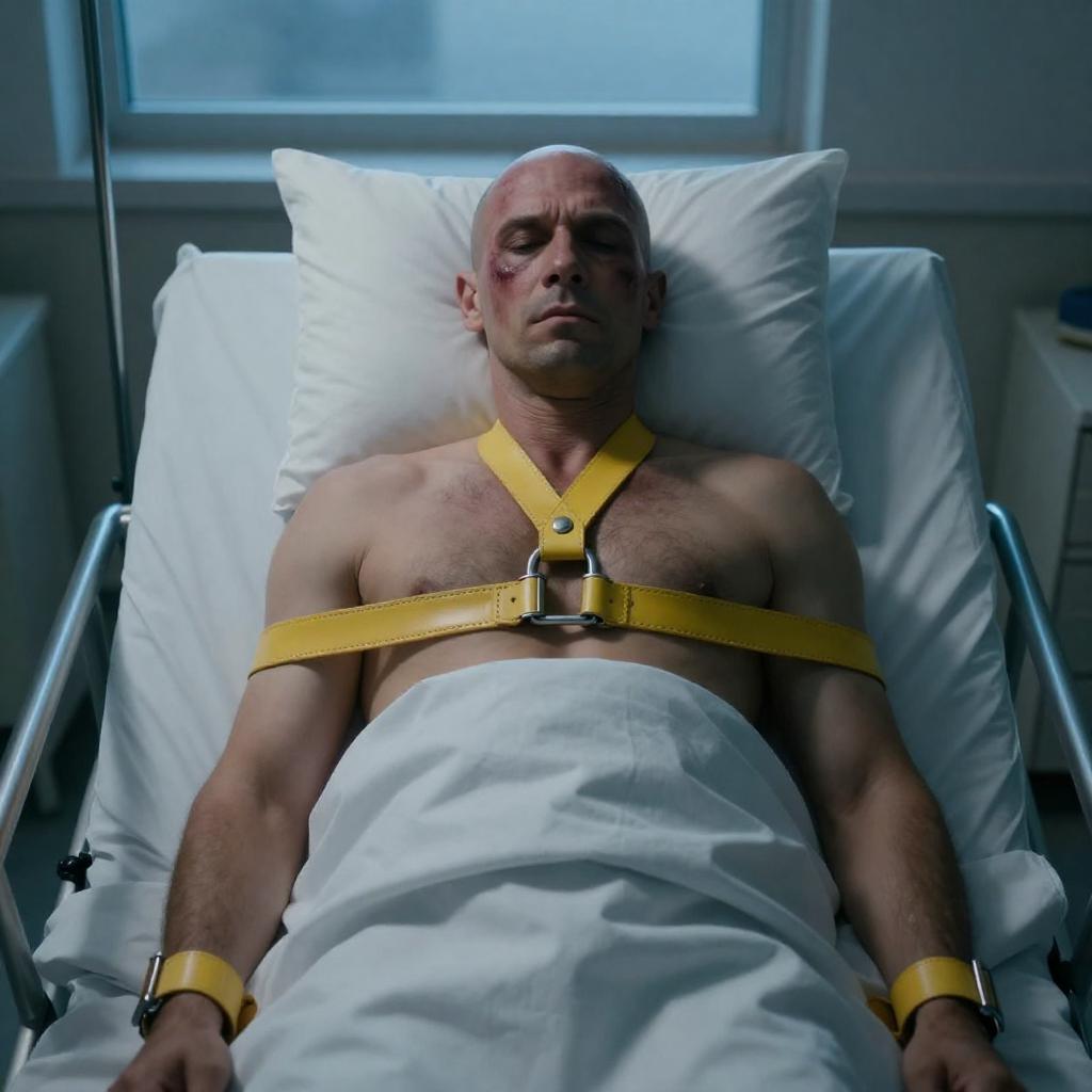 Photograph of a bald, middle-aged man with a bruised face, lying in a hospital bed with white sheets. He is restrained with yellow leather straps across his chest. Dim blue light from a window behind him casts shadows, creating a tense atmosphere. The bed has metal rails on either side.