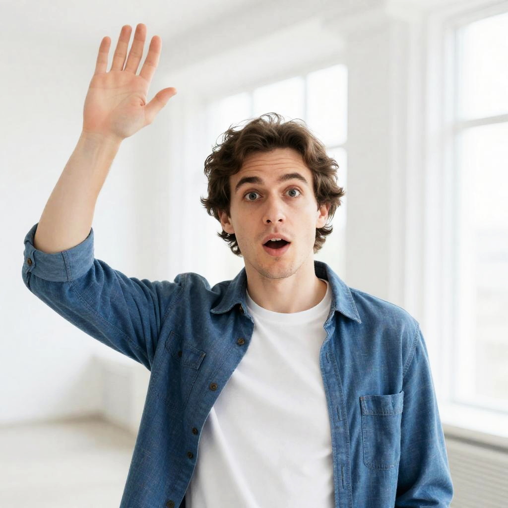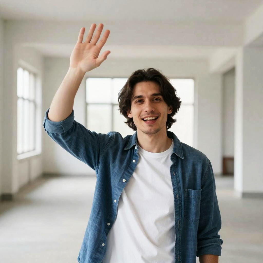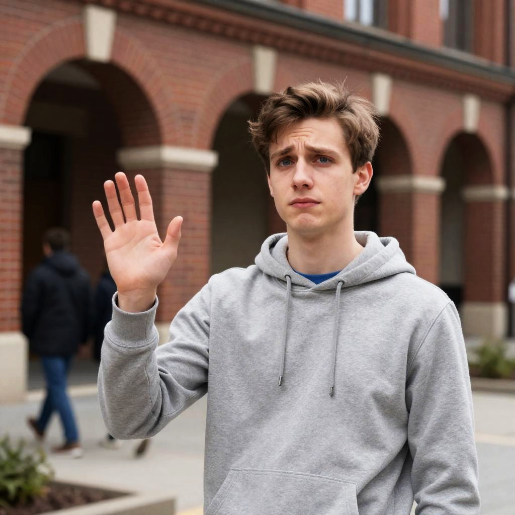 Photograph of a young man with short brown hair, blue eyes, and a slightly confused expression, raising his right hand. He wears a gray hoodie over a blue shirt. Background: brick building with arched doorways, two people in dark clothing walking away, and a sidewalk with small plants.