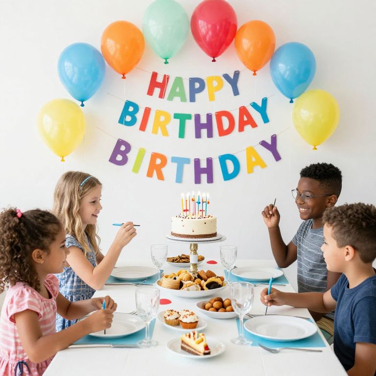 Photograph of four children celebrating birthday with colorful balloons, "HAPPY BIRTHDAY" banner, cake, and dessert at a white table.